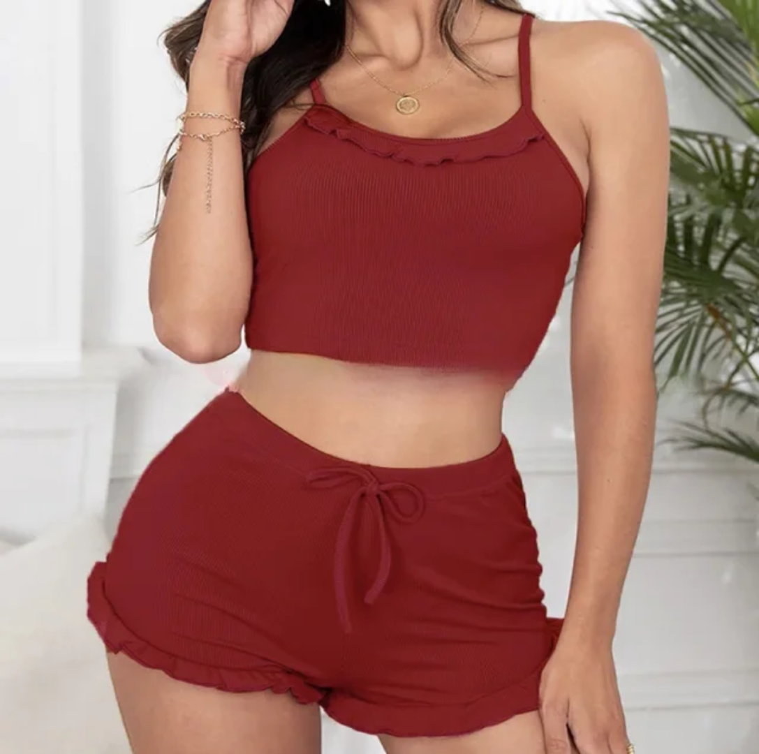 Design: Features a short top with a small decorative trim at the chest, and matching shorts with a trim on the leg openings.
